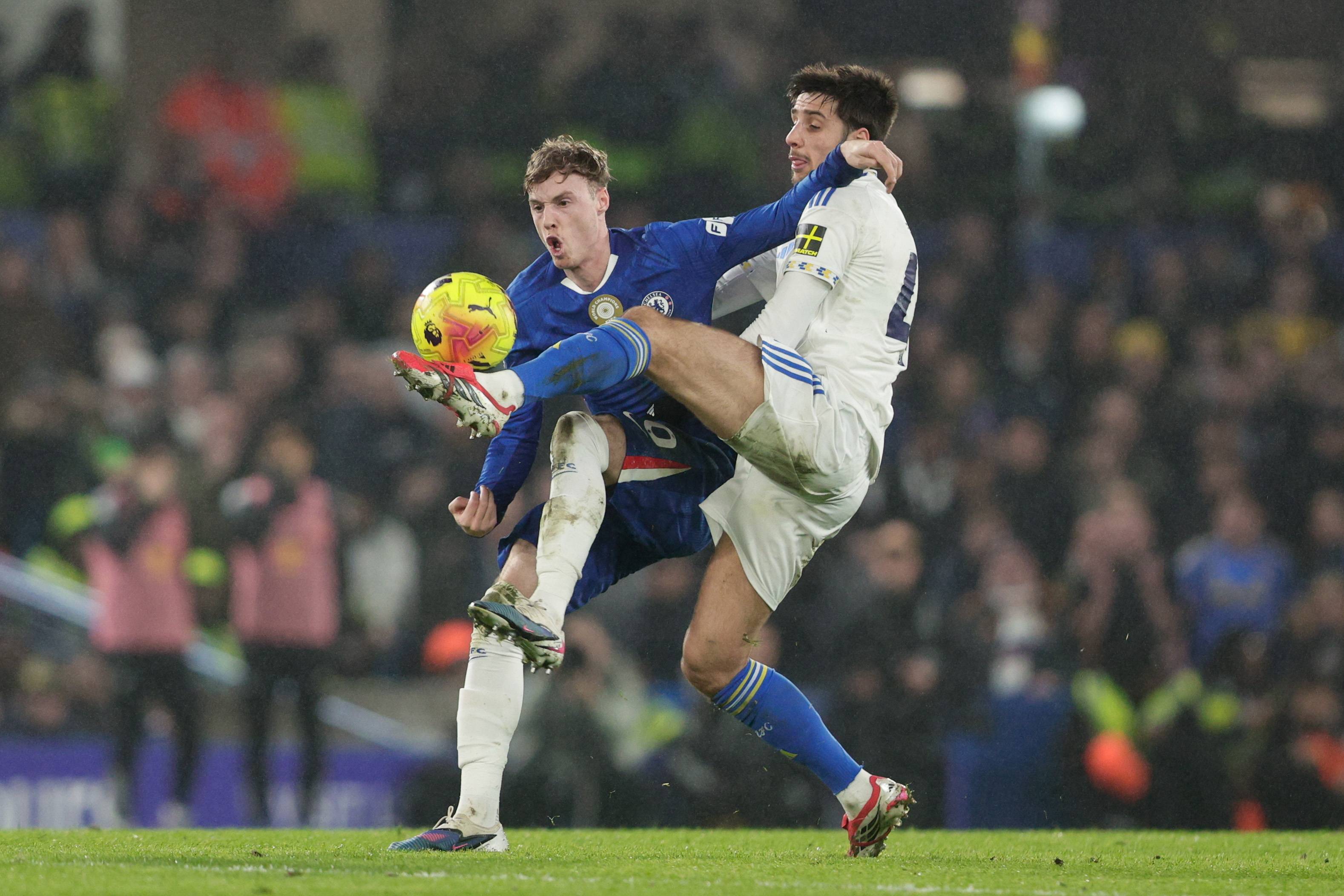 2月10日,切尔西队球员帕尔默(左)与利兹联队球员格鲁耶夫拼抢。 新华社/欧新